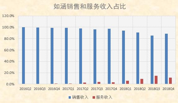 2017财年(截至2017年3月31日的前12个月),服务收入在如涵营收中占比0.9%,2018财年扩大至3.7%,在2018自然年的前三个季度,如涵将服务收入的占比扩大至11.7%。但相比直营的销售收入,依然很少。