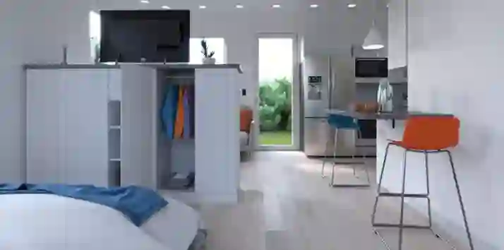 不过,从这个房子的供应商提供的房屋内部图来看,可不像我们传统印象中的简易房:面积接近400平方英尺(38平方米),里面卧室厨房餐厅卫生间一应俱全。
