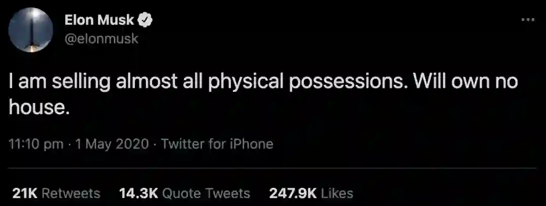说到房子,马斯克两年前就在推特上公开表示过,自己打算卖掉所有实体财产,做个「无房者」。