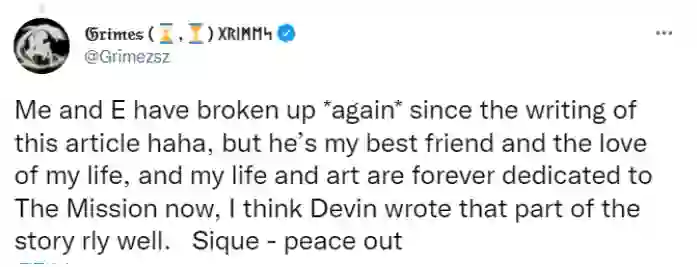在接受了《名利场》的专访后,Grimes发推称与马斯克「再次分手」。