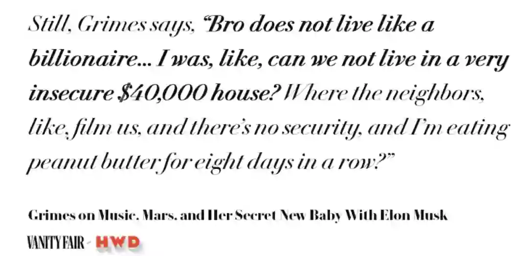 如此吊诡的发言来自马斯克前女友Grimes,最近她接受了来自《名利场》的专访。