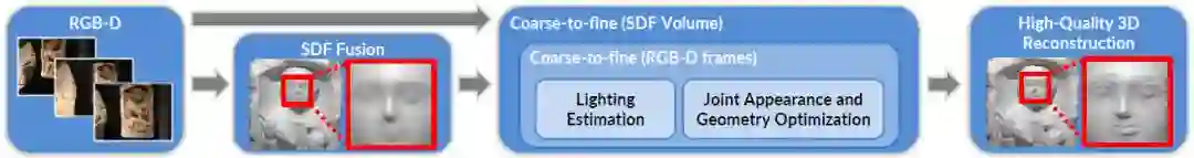 图2。我们的结合处外观和几何优化方法的概述。我们的流程将场景的RGB-D数据作为输入,并将其融合到符号距离场(SDF)中。在嵌套式从粗到细的方法中,估计空间变化的光照,并用于联合优化场景的外观和几何形状,产生高质量的3D模型。