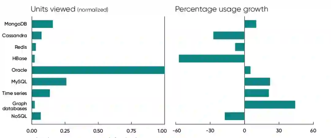 在去年,图形数据库受到越来越多人的关注,其内容增加了44%,但这仍然是一个较小的类别。同样,有关时序数据库的内容增加了21%。时序数据库指的是用来存储时序列数据并以时间(点或区间)建立索引的软件,对于关于监控、日志记录和可观察性的应用程序非常重要。