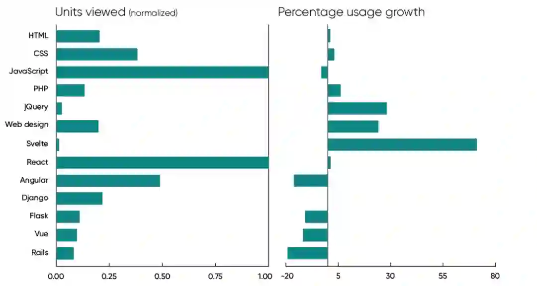 而有关React框架的内容数量基本没有变化(增长2%),但Angular框架的内容显著减少(减少16%)。JavaScript的数量与React的几乎相同,Rails的内容则减少19%。