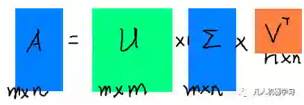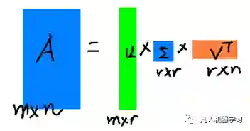右边的三个矩阵相乘的结果将会是一个接近于A的矩阵,在这儿,r越接近于n,则相乘的结果越接近于A。而这三个矩阵的面积之和(在存储观点来说,矩阵面积越小,存储量就越小)要远远小于原始的矩阵A,我们如果想要压缩空间来表示原矩阵A,我们存下这里的三个矩阵:U、Σ、V就好了。