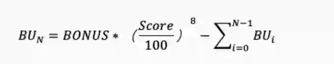 奖金额度获取评判指标说明:【BOUNS】表示奖金池总额度;【Score】表示模型得分;【BU_N】表示第n位达到奖金获取标准并更新排行榜后所获得的奖金总额度