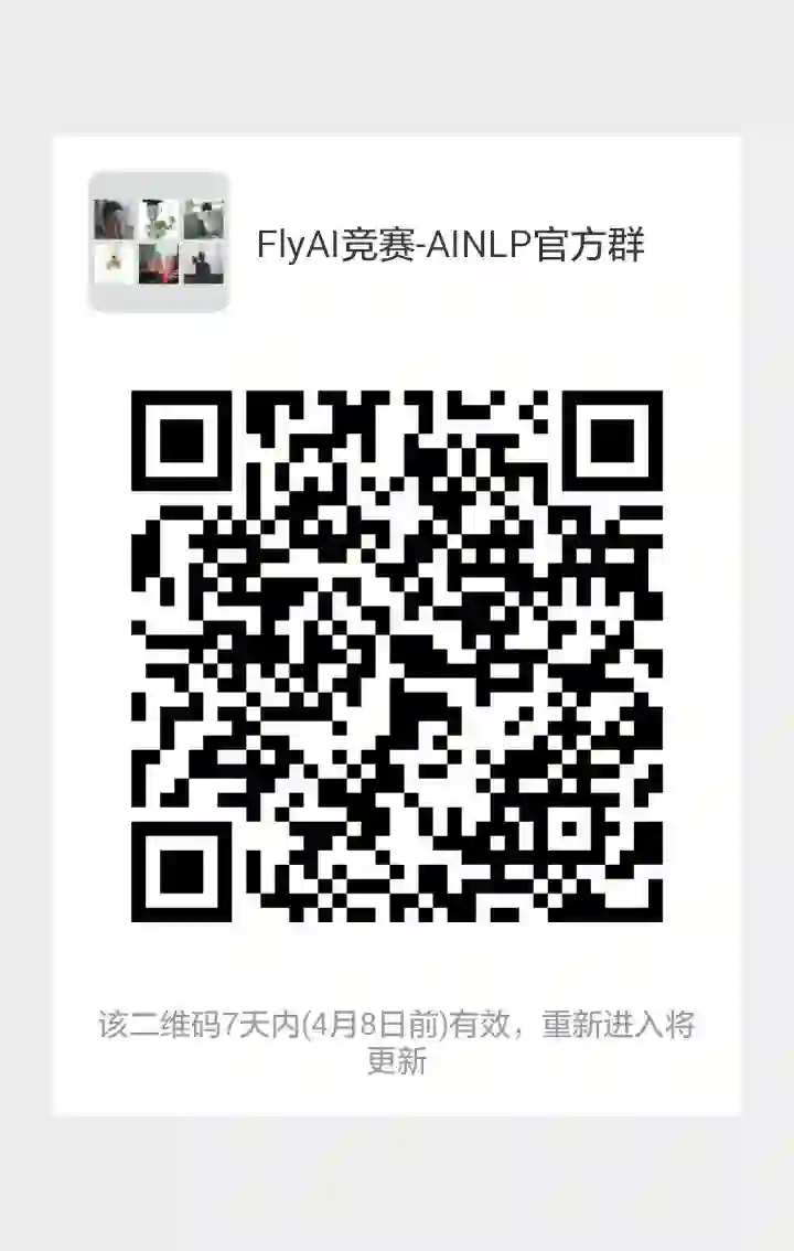 FlyAI联合AINLP建立了专门的竞赛讨论群,群内有官方技术人员答疑,欢迎下方扫码进群: