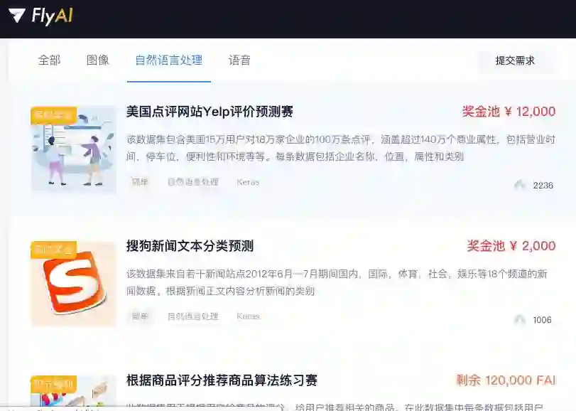 FlyAI是一个为算法工程师提供(深度学习)项目竞赛并支持GPU离线训练的网站。目前每周更新两个以上现金奖励的竞赛项目。项目涉及领域包括图像识别/分类/检测、自然语言处理(NLP)、语音识别等。