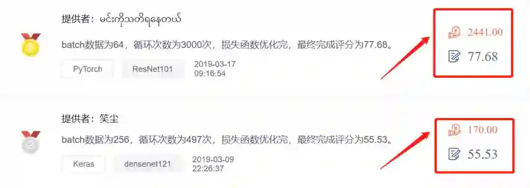 提交离线训练,系统自动评判模型Score。奖金获取额度计算公式如下: