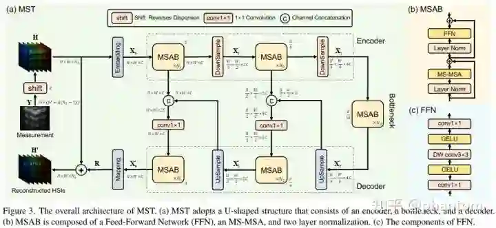 针对从 2D measurement 到 3D HSI cube 的光谱图像复原,我们提出了 Mask-guided Spectral-wise Transformer (MST),如图3 (a) 所示。MST是一个对称的 U 形的网络,其基本组成单元为 Mask-guided Self-Attention Block (MSAB), 如图3 (b) 所示。MSAB 中最重要的就是 Mask-guided Spectral-wise Multi-head Self-Attention (MS-MSA)。MSAB 包含两个 Layer Normalization (LN),一个 MS-MSA 和一个前向神经网络 Feed Forward Network (FFN),如图3 (c) 所示。