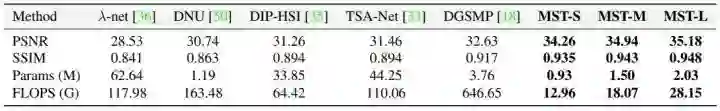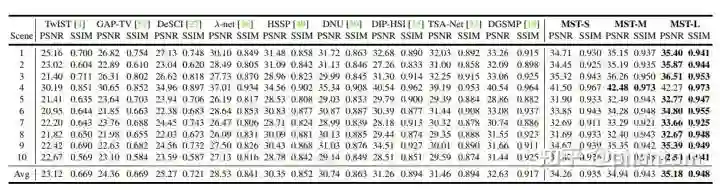 先验货,MST 与 MST++ 与 SOTA 方法对比如图1所示,很轴为计算量,纵轴为性能,圆半径代表参数量。MST 与 MST++ 占据了左上角,参数量也非常小,实现多快好省的高光谱图像重建。