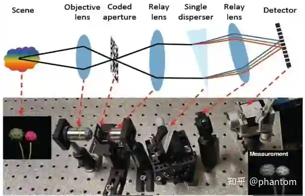 CASSI系统首先通过一个编码孔径掩膜对成像场景的各光谱通道进行调制,然后通过一个三棱镜进行色散后在相机上生成一个二维的快照估计图(compressive measurement)。那么有一种获取高光谱图像的方法就是用CASSI结合从measurement到HSI的复原算法,我们将这样的方法记为SCI-to-HSI。