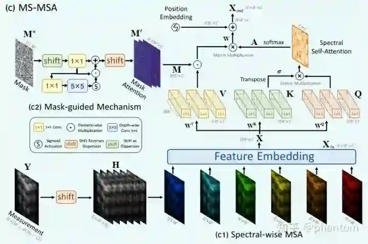 其中的 MS-MSA 又可以拆解为两部分,即 Mask-guided Mechanism (MM) 和 Spectral-wise Multi-head Sefl-Attention (S-MSA)。为了避免大家觉得枯燥无味,这里就不给大家看比较琐屑的公式了。下面我会用语言大概介绍一下,相关细节请参照原文。MS-MSA的结构如图5所示