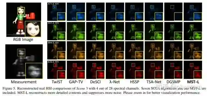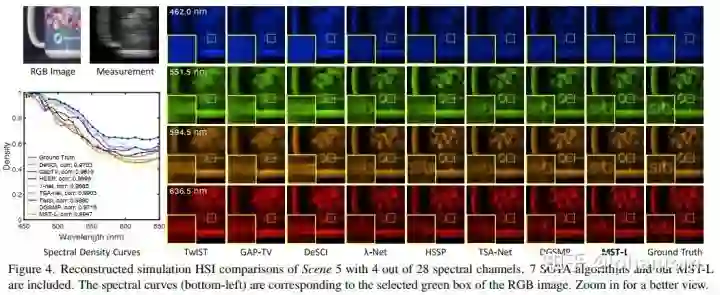 定性对比:在 simulation 和 real 数据上的定性对比分别如图6和图7所示。MST恢复出更多的光谱细节,同时从光谱曲线上来看,也取得了更高的 consistency, 更印证了我们方法的优越性。