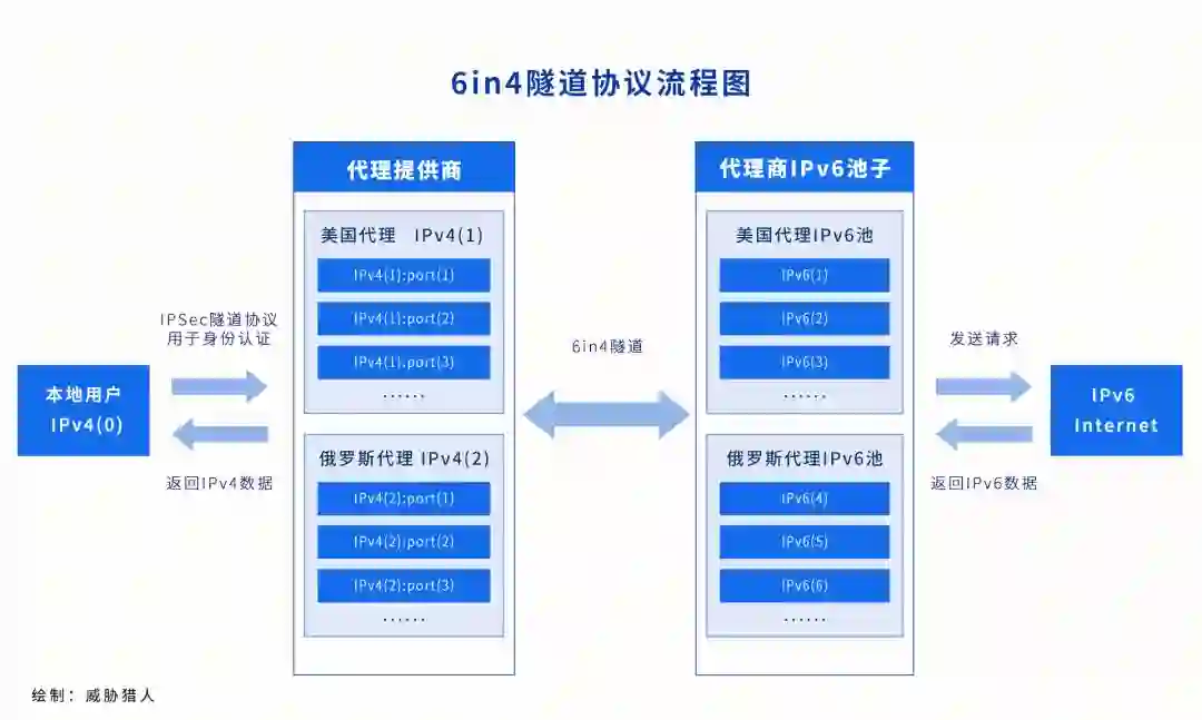据调查,国外的代理平台早已存在出售IPv6代理的情况。由于当前IPv6普及率还较低,IPv6代理商并不是直接提供IPv6地址和端口,提供的依旧是IPv4和端口,通过类似6in4加IPsec的隧道协议,将IPv6数据包封装在IPv4数据包中。