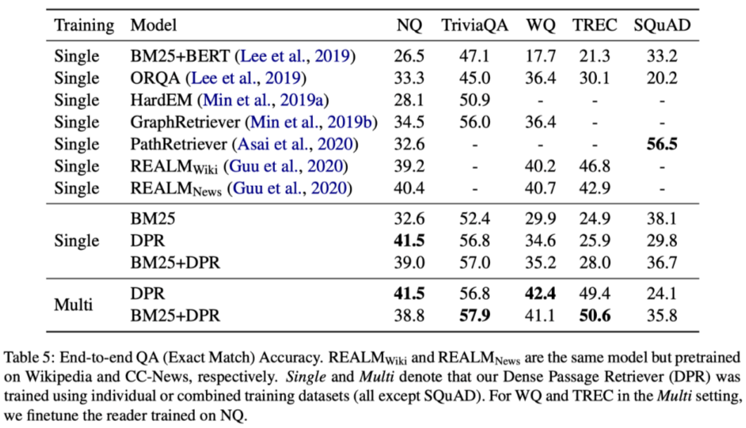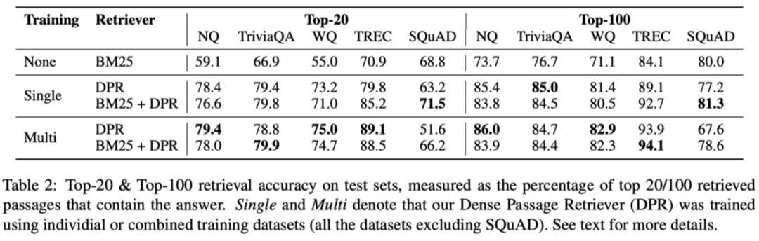 当使用多个数据集进行训练时,TREC(五种数据集中最小的数据集)可以从更多的训练示例中获益。相比之下,NQ 和 WebQuestions 得到了适度的改进,而 TriviaQA 则略有下降。在某些情况下,可以通过在单数据集和多数据集设置中结合 DPR 和 BM25 进一步改进结果。