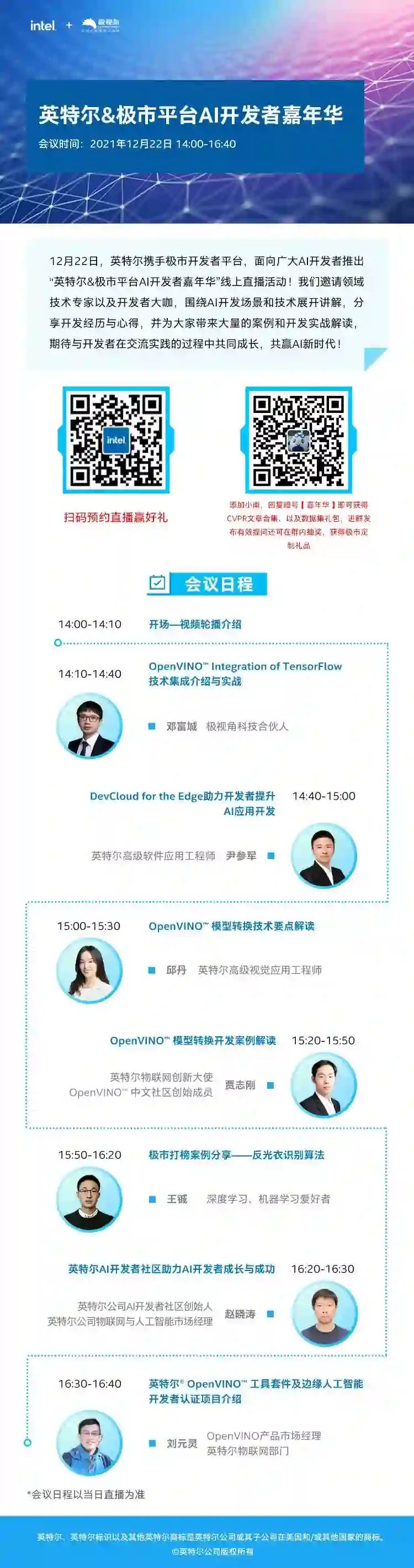 12月22日,英特尔携手极市开发者平台,面向广大AI开发者推出线上直播“英特尔&极市平台AI开发者嘉年华”活动!行业大咖将率先现身主题演讲,与大家分享以AI为核心的全场景智慧时代的行业动态。