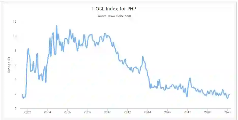 我们可以看出,在过去的十年中,PHP 一直在走下坡路,如今几乎已跌至谷底。下面是来自TIOBE 指数的一个趋势图。