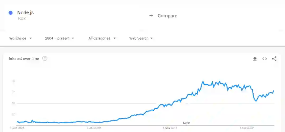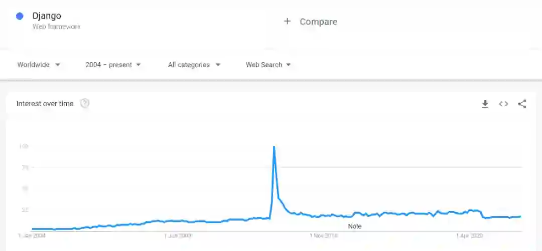 Node.js 获得的关注度高于 Django。显然,很多人都很喜欢它。但相似的是,这两个框架都在增长。未来它们都会变得非常强大。