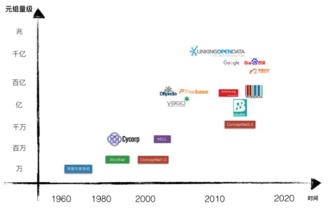 但我们要强调知识图谱与传统专家系统时代的知识工程有显著的不同。首先,传统专家系统的知识库构建大多以实现高端的决策智能为目标,而知识图谱虽然也被用来实现大数据决策分析(如Plantir),其首要的应用目标是辅助搜索和智能问答。另外一方面,与传统专家系统时代主要依靠专家手工获取知识不同,现代知识图谱的显著特点是规模巨大,无法单一依靠人工和专家构建。传统的知识库,如由Douglas Lenat从1984年开始创建的常识知识库Cyc仅包含700万条的事实描述(Assertion),最新的ConceptNet 5.0也仅包含2800万RDF三元组关系描述,而现代知识图谱已经包含超过千亿级别的三元组。