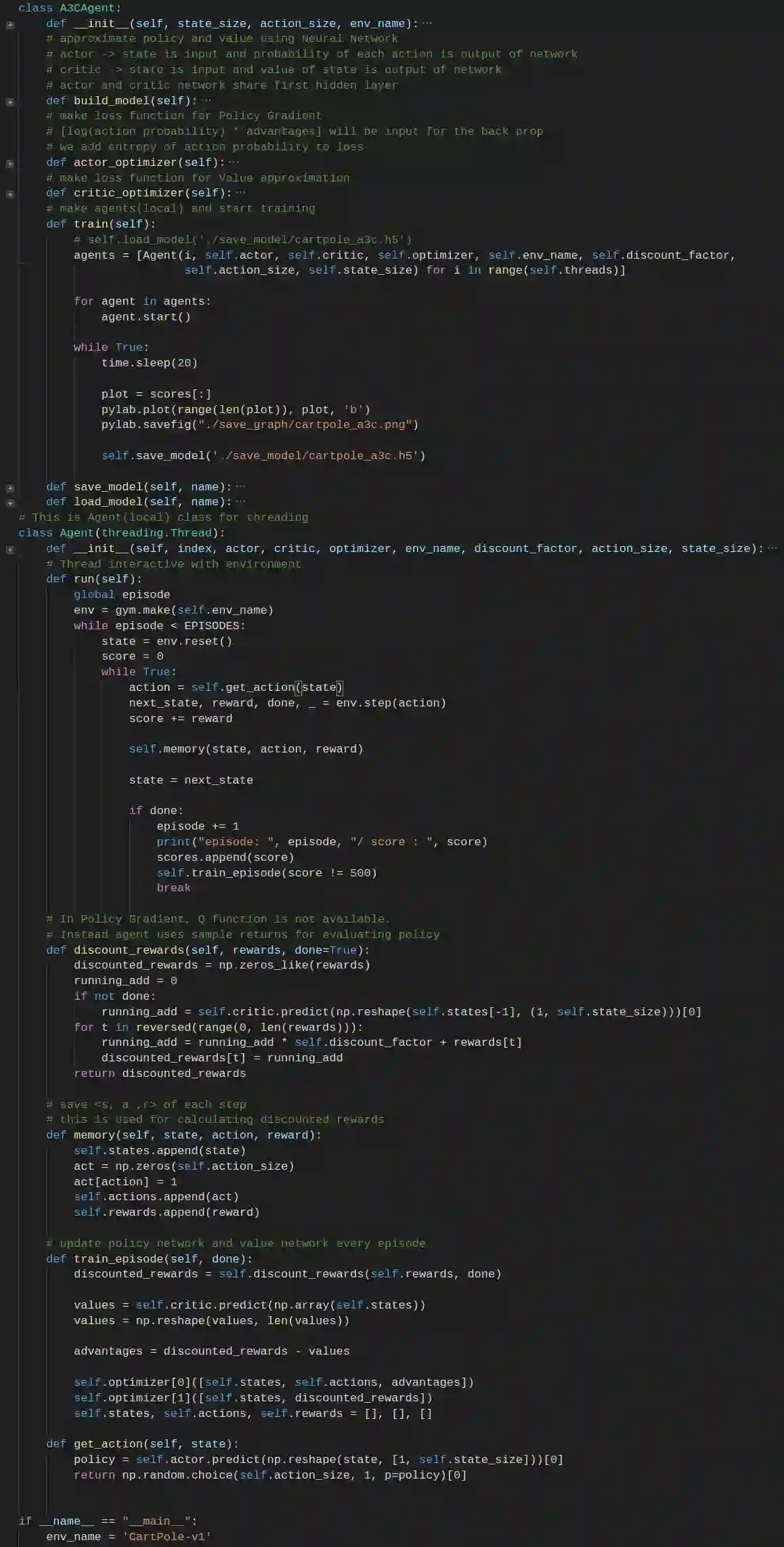 https://github.com/rlcode/reinforcement-learning/blob/master/2-cartpole/5-a3c/cartpole_a3c.py
