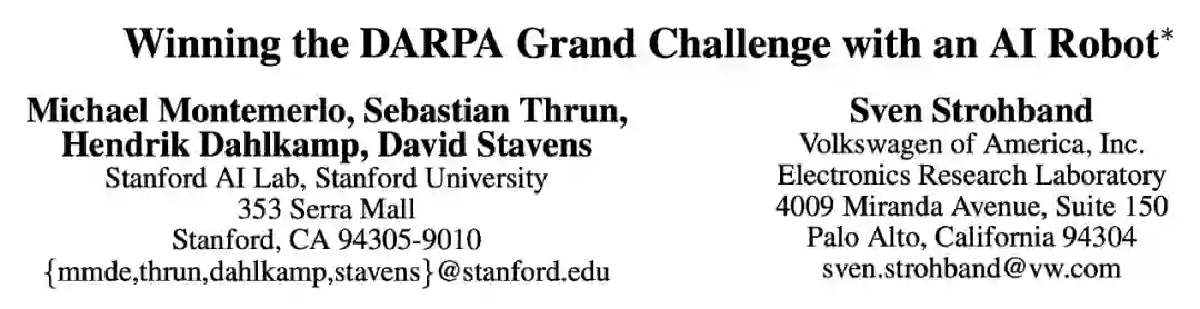 AAAI 2022 经典论文奖颁发给了 2006 年的大会论文《Winning the DARPA grand challenge with an AI robot》作者 Michael Montemerlo、Sebastian Thrun、Hendrik Dahlkamp、David Stavens、Sven Strohband 等人。
