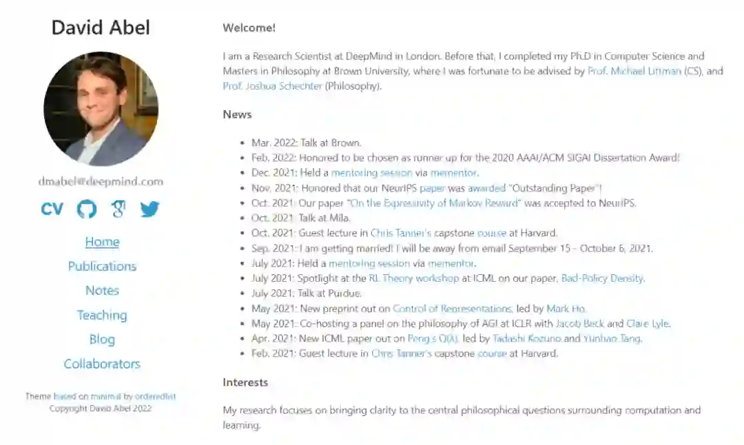 本文作者 David Abel 博士毕业于布朗大学,现为 DeepMind 的研究科学家。他通常研究强化学习问题,致力于从计算学习理论、计算复杂性和分析哲学中汲取工具和观点。