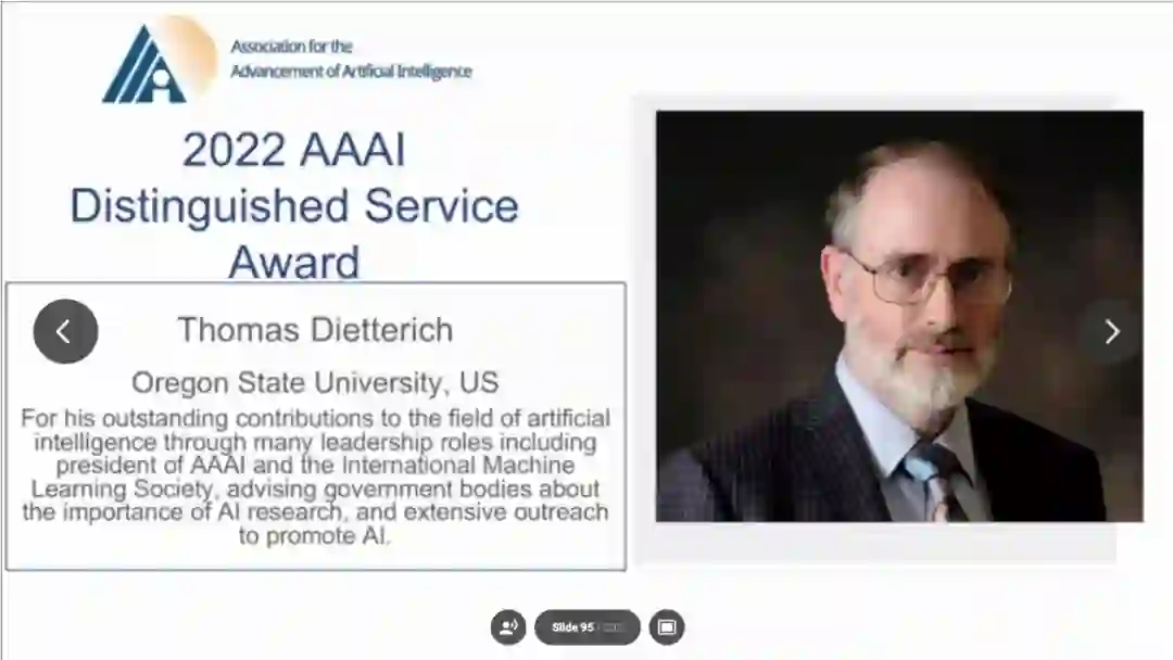 今年的获奖者为俄勒冈州立大学计算机科学系的名誉教授、机器学习领域的先驱之一 Thomas Dietterich,表彰他通过担任 AAAI 主席和国际机器学习协会主席等职务对人工智能领域的贡献。