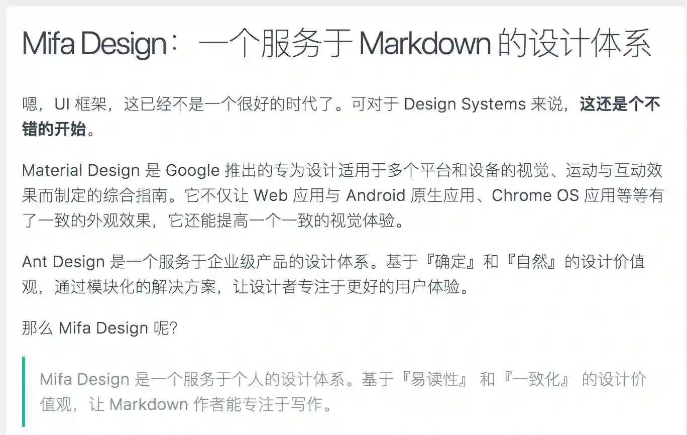 Mifa Design 是一个服务于个人的设计体系。基于『易读性』 和『一致化』 的设计价值观,让 Markdown 作者能专注于写作。