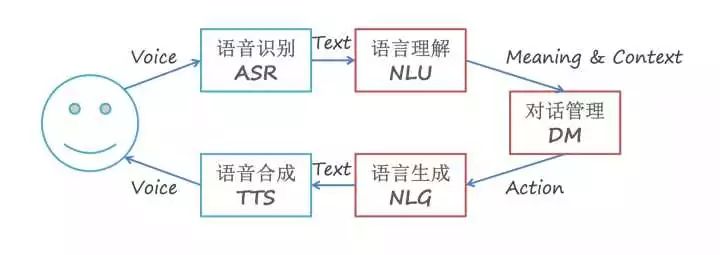 简单描述一下这个流程图常见的一种信息流动方式,首先是语音识别 ASR,产生语音识别结果也就是用户话语;语义解析模块 NLU 将