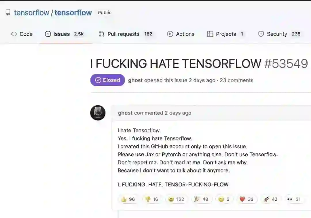 虽然TensorFlow的差评如海,甚至有用户专门注册一个GitHub账号开个issue来骂TensorFlow,但TensorFlow在工业界大哥的地位PyTorch仍然无法撼动。