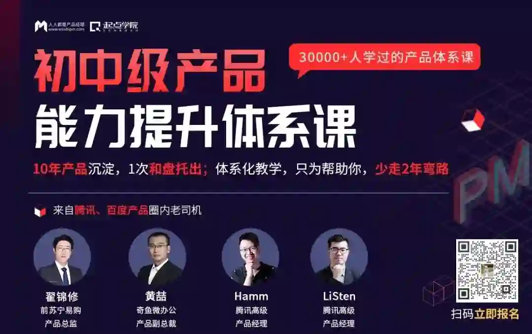 如果你也想掌握一套系统的、经过大厂验证的产品知识与方法;培养自己的认知——关于不同行业内产品工作的“共性”与“差异”;链接更多优秀的产品人,让自己具备跨行业的快速学习能力,拥有深度思考能力和广阔的产品视野。