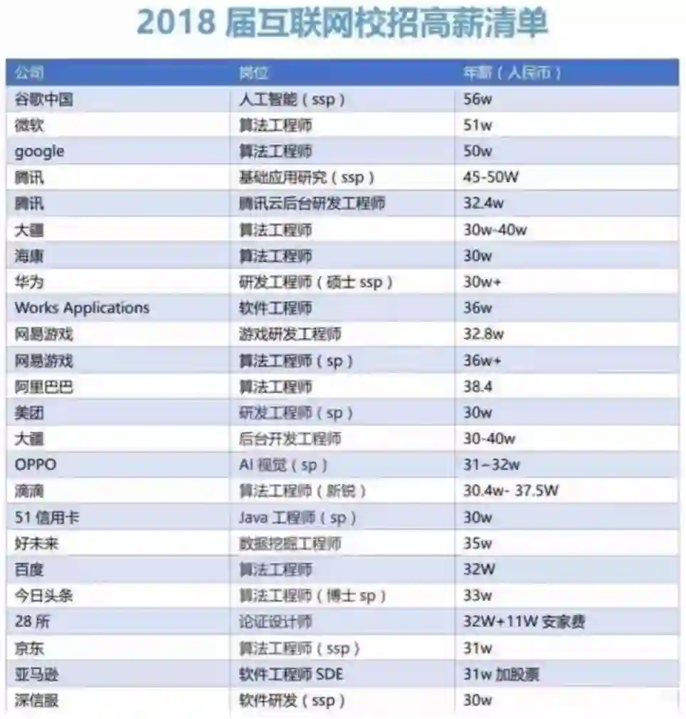 腾讯、阿里、百度、谷歌中国、微软等知名互联网企业为人工智能岗位开出的年薪水平均达到了 30 万以上。很多相关专业的应届毕业生,甚至还没有出校门,就被各大企业一抢而光。