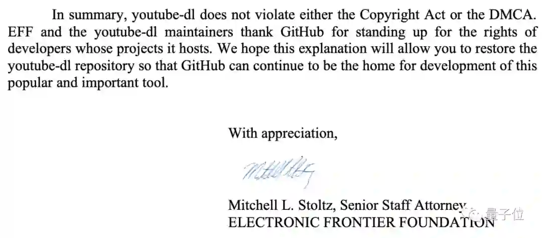 11月15日,GitHub收到电子前沿基金(Electronic Frontier Foundation)一封电子文档,文中称youtube-dl并没有违反《美国数字千年版权法案》。