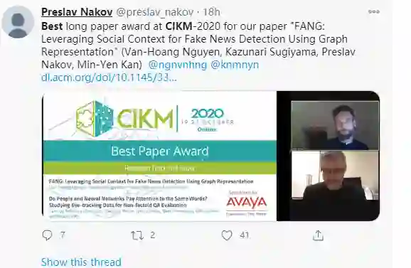 第29届国际计算机学会信息与知识管理大会(The 29th ACM International Conference on Information and Knowledge Management, CIKM 2020)于2020年10月19日-10月23日在线上召开。CIKM是CCF推荐的B类国际学术会议,是信息检索和数据挖掘领域顶级学术会议之一。本届CIKM会议共收到投稿920篇,其中录用论文193篇,录取率约为21%。本篇介绍来自NUS关于利用图表示假新闻检测工作,获得最佳长论文!