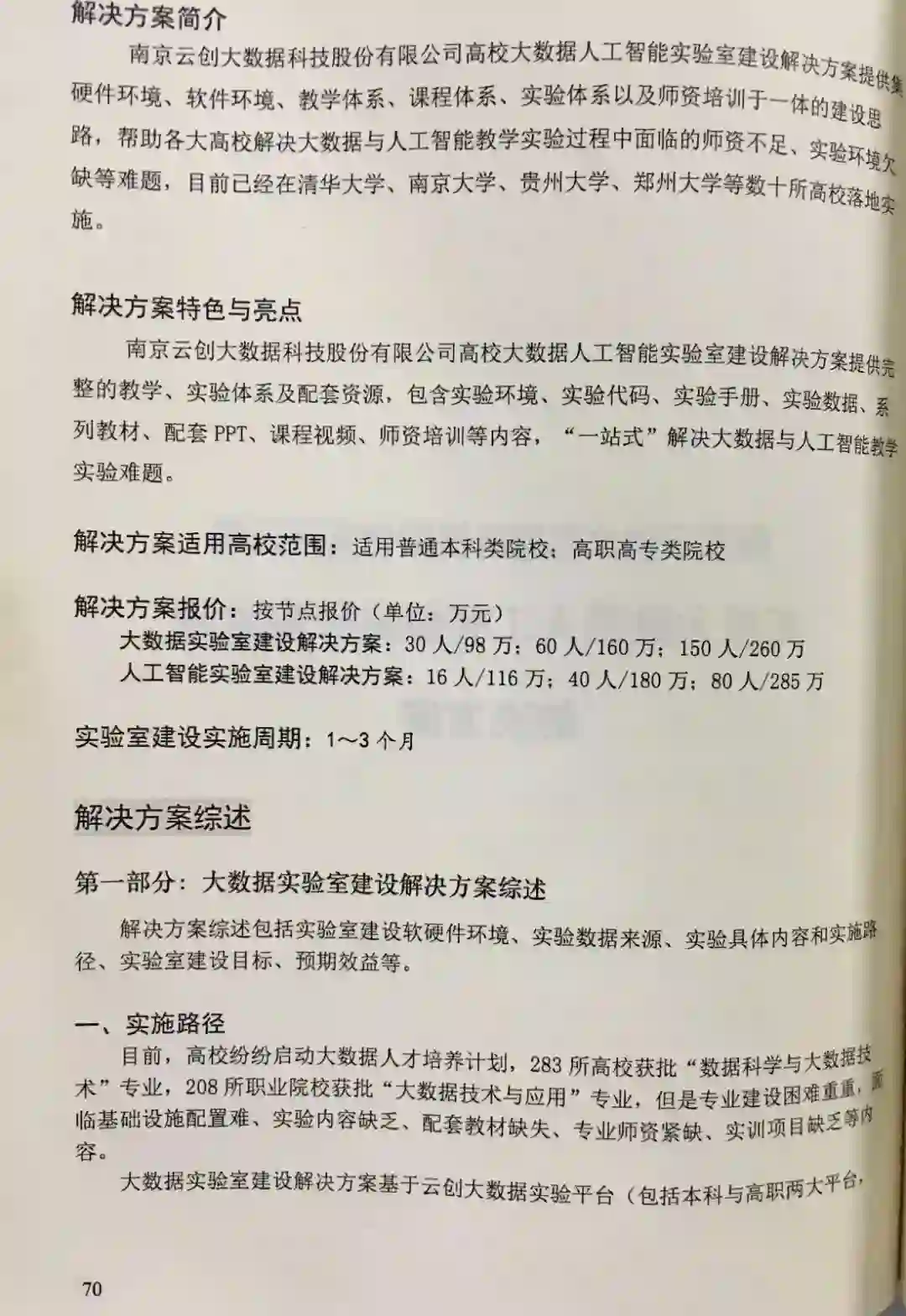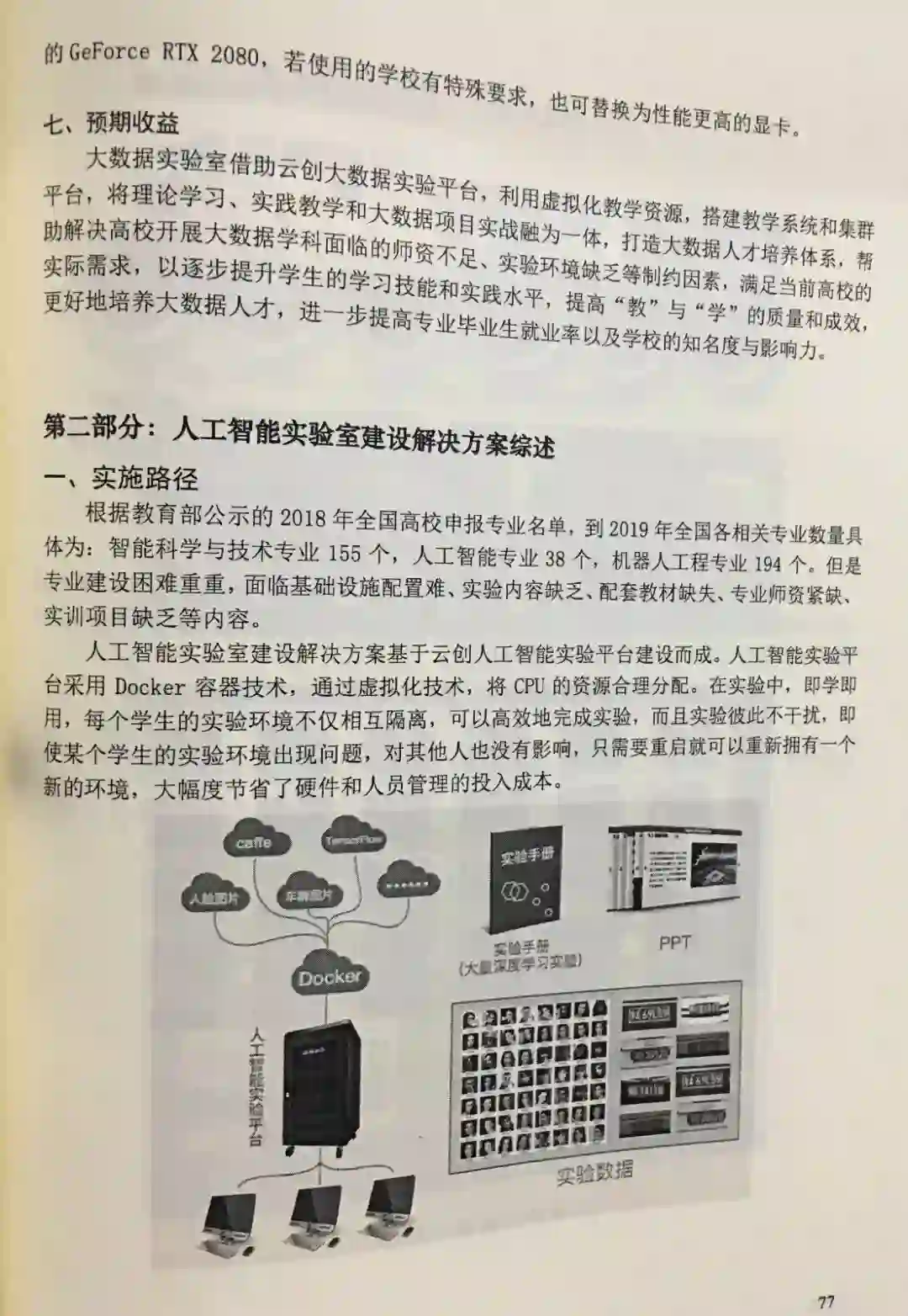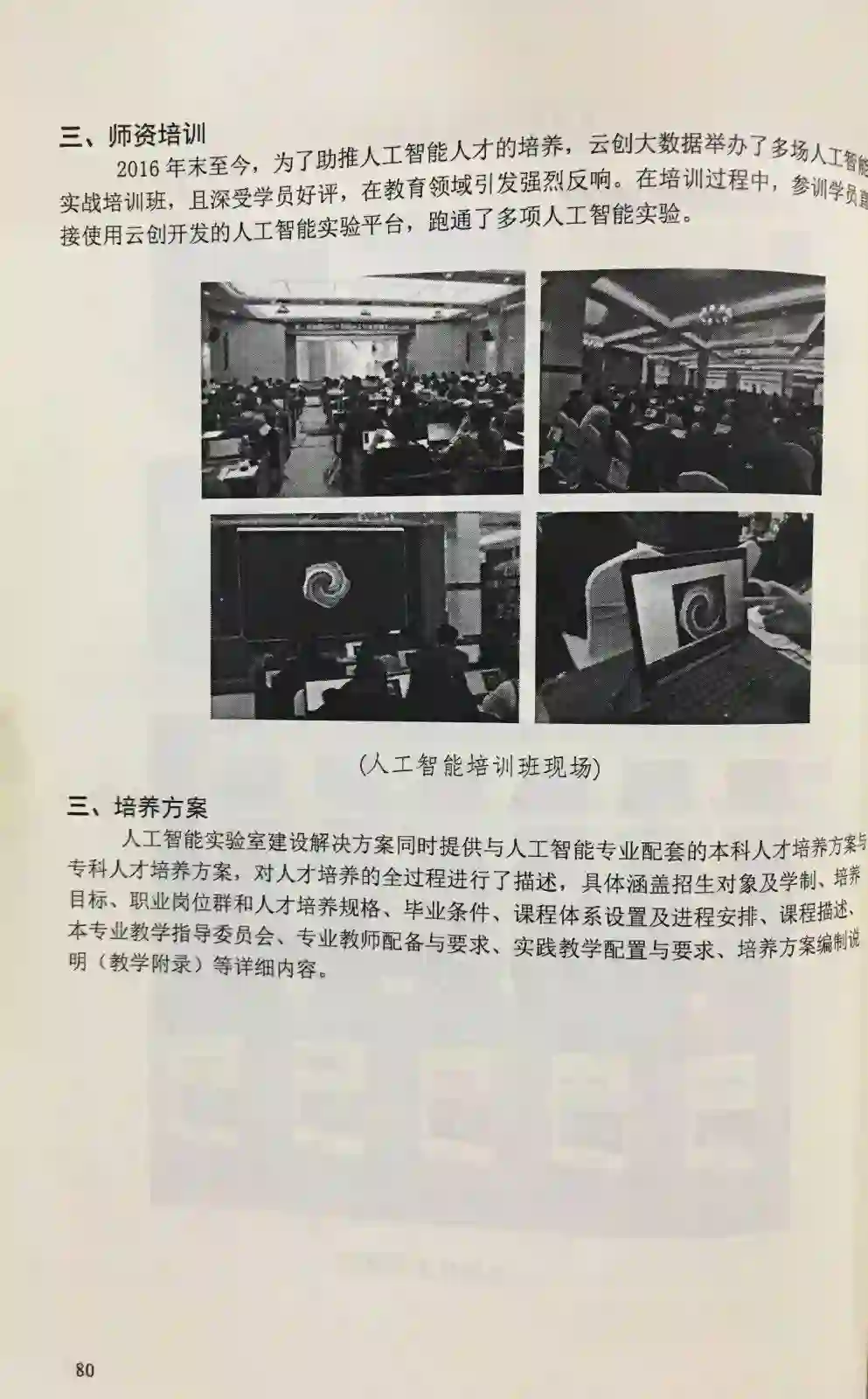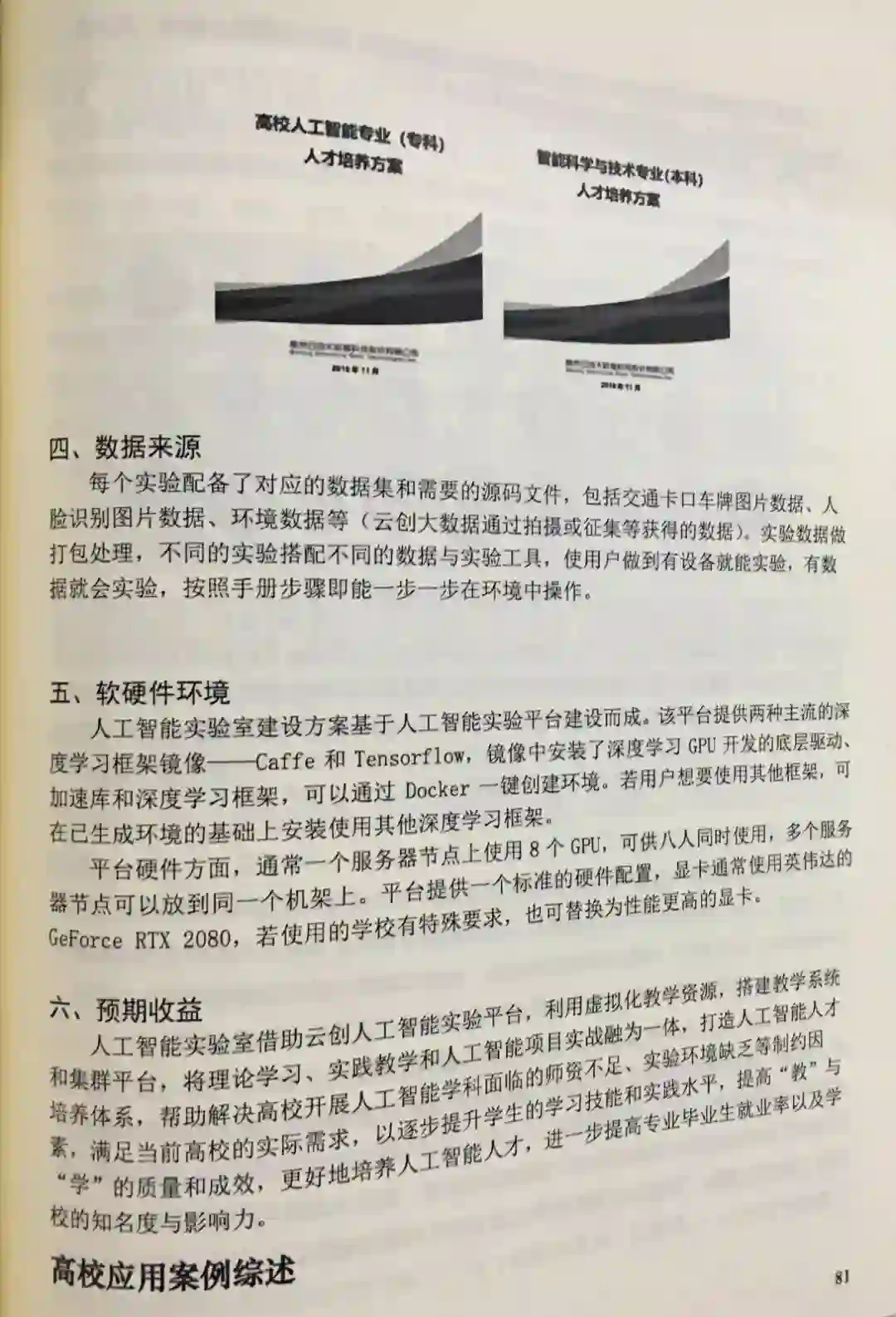 《选型采购指南》全书共分领导篇、院士篇、专家篇、方案篇、政策篇、专业篇6个篇章。在方案篇中,云创大数据提供的高校大数据与人工智能实验室建设解决方案得以亮相。该方案提供集硬件环境、软件环境、教学体系、课程体系、实验体系以及师资培训于一体的建设思路,可以帮助各大高校解决大数据与人工智能教学实验过程中面临的师资不足、实验环境欠缺等难题。