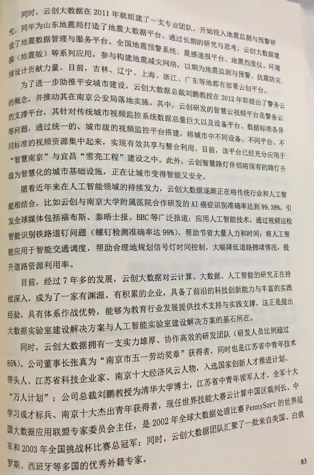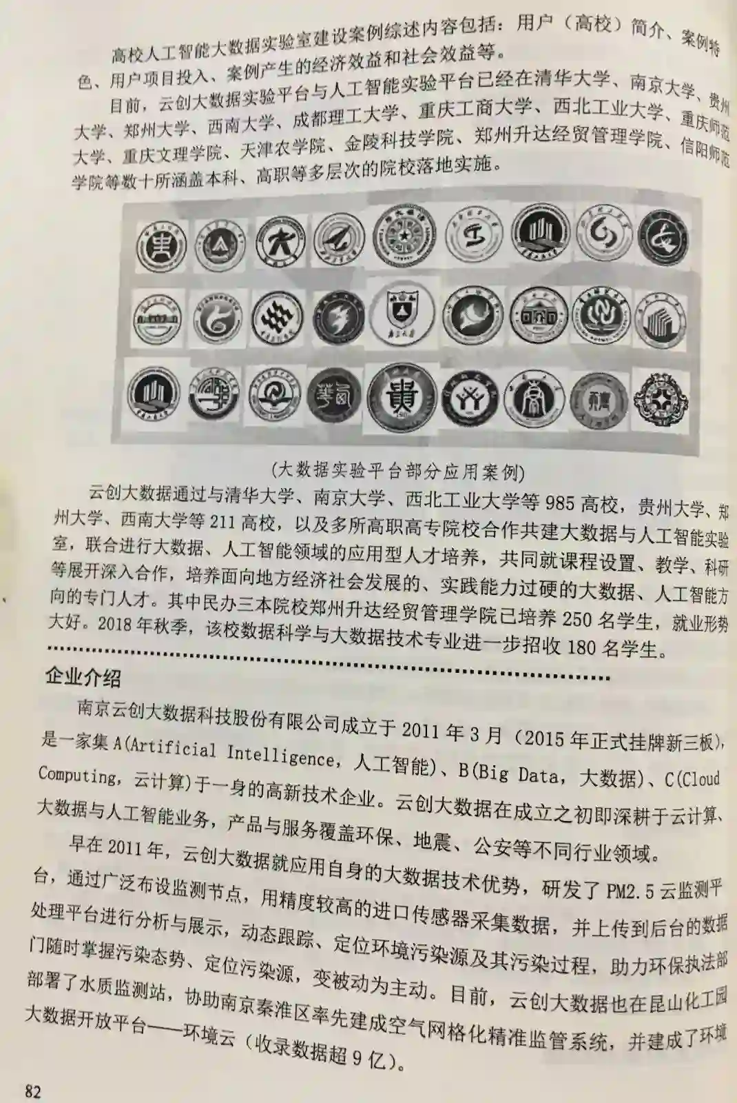 此外,云创包括大数据实验平台、人工智能实验平台在内的大数据人工智能系列产品已被清华大学、南京大学、贵州大学、郑州大学、陕西师范大学、重庆工商大学、郑州升达经贸管理学院、西安培华学院、西华大学等单位采用,从而大幅提升了学生的动手能力和就业率,受到学校师生的广泛好评。