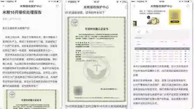 11月2日,米熊在平台上发布10月侵权处理报告:自项目上线以来,共对1371条视频进行TSA可信任时间戳认证……在针对网络盗版打击的过程中,10月共计发现网络盗版242条,已处理盗版81条,盗版视频主要分布为闲鱼、淘宝等地。