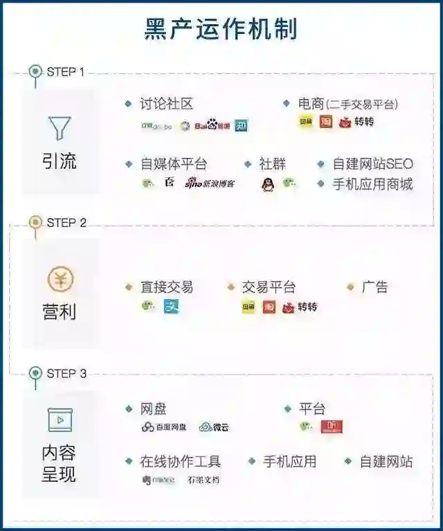 他也将黑产运作机制总结为三个步骤: