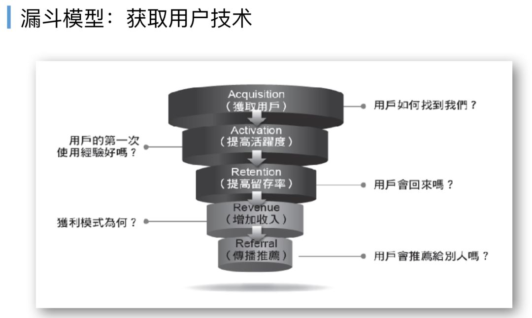 假设驱动开发还有一种做法,这种做法也是业界很通用的叫做漏斗模型,有些地方也叫漏斗获取用户模型的方法,最核心的是怎么样通过用户测试的方法去一层一层看到用户是如何使用产品功能进来的,每跳转一次用户流失了多少,最终注册和付费。