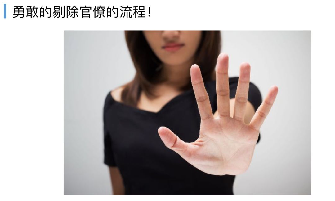 书中很严肃的提到一点,除了所有有必要的流程,DevOps团队成员应该勇敢的站出来,勇敢的剔除官僚的流程。