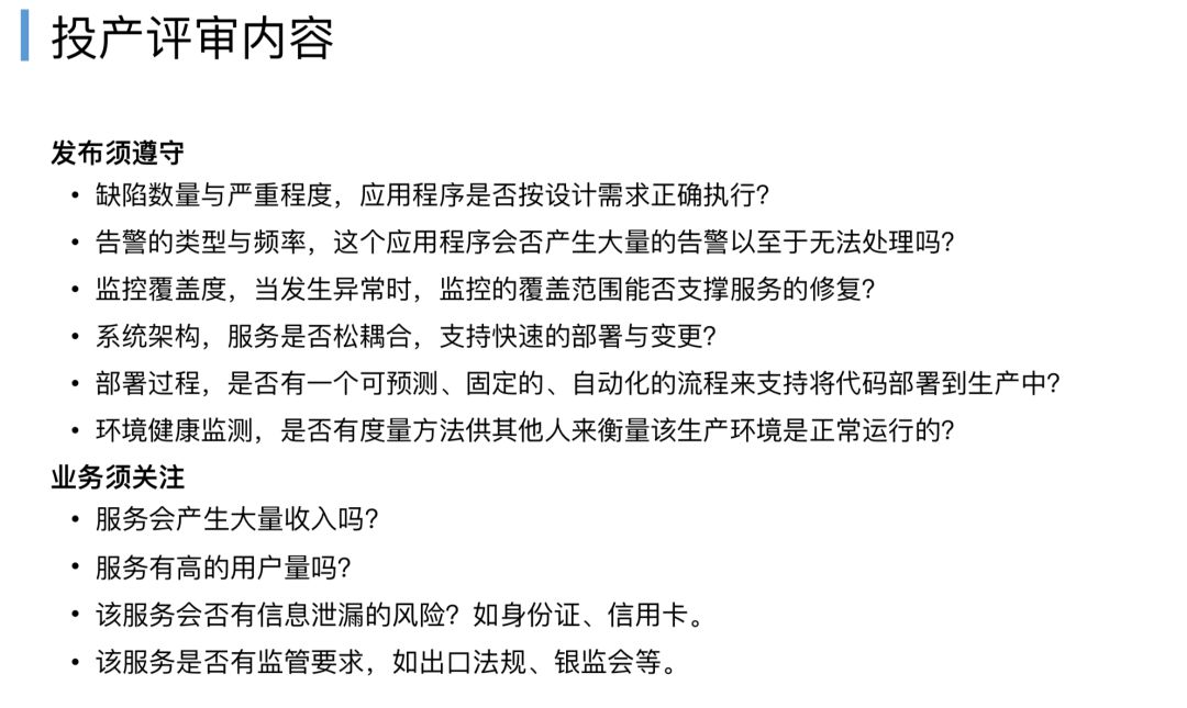 审查什么,谷歌SRE团队会给一个检查清单,里面列出了这个程序要投产,必须得符合,书中没有具体描述要符合怎么样的东西,只给了一些举例,假设你一定要高可用,不能写本地硬盘,一定要有状态等等,就是前面所说的非功能规范的要求,跟业务逻辑无关的,但是必须要求开发提前做好。