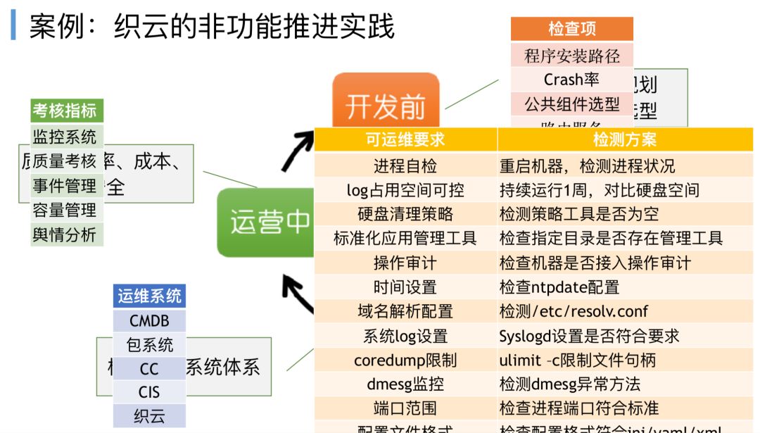 非功能规范,织云也有一些实践案例,运维对应用程序的整个生命周期分成四个阶段,在不同阶段做不同事情,要把非功能规范落实到地,例如运维在开发前会提出的日志标准化格式要求,如JAVA程序、C程序、PHP程序,对应的目录结构、日志存放等。