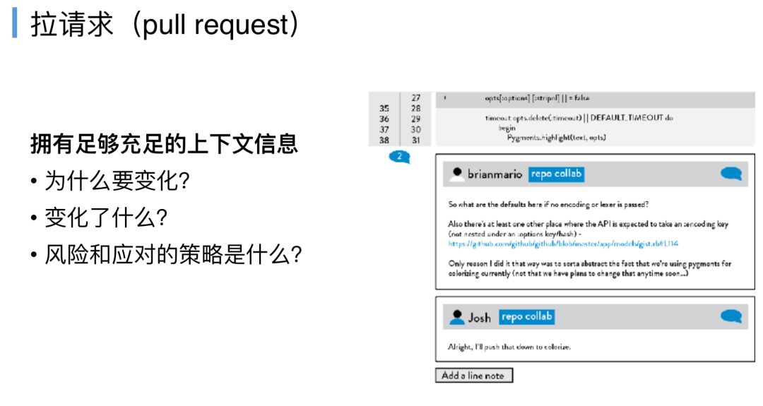 他们怎么实践出来的,讲一个笑话,GitHub的CIO提过一个笑话,如果我们在提交代码的时候,这个代码的变动只有十行,我们要求另一个程序员给我们做代码审核,十行的代码很有可能给你提出十个问题,但是如果你提交一个变更,这个变更改动了五六百行代码,你还是找回他,同一个同行的程序员给你做代码的交叉审核,他会跟你说,你的代码写得不错,找不到一个问题。