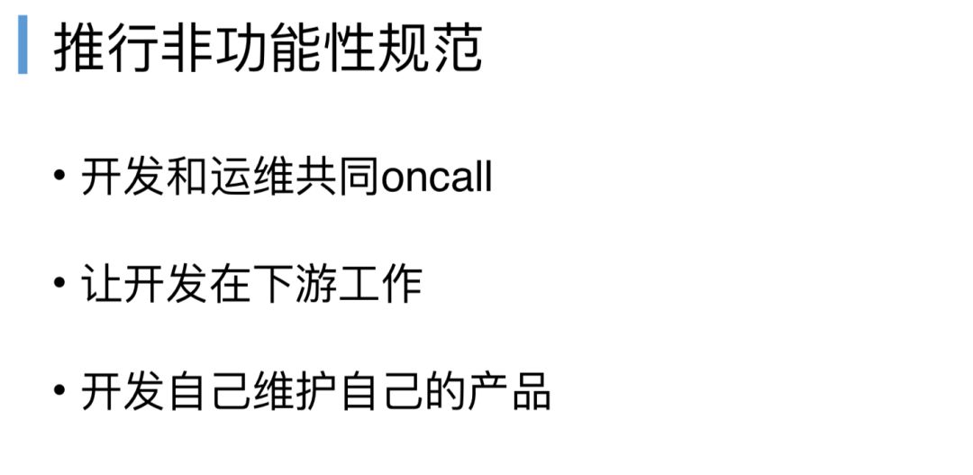 要落后这样的发布文化,没办法回避一点,必须要推进我们的非功能规范,无论是我们的监控指标、覆盖度,这些跟业务逻辑无关,你的日志要输出什么能够,你的部署是不是支持独立部署的,是不是具备独立发布的,是不是高可用的等等,都是非功能规范。