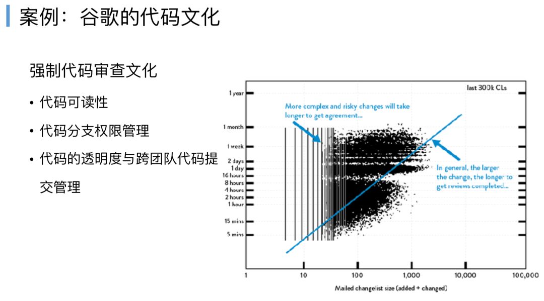 这里有谷歌的案例,X轴表示代码变化的大小,Y轴是评审的耗时,如果我们每次变更就是十行,可能一个人5分钟就可以评审完,如果变更一万行,他需要一个月甚至是几个月,强调了几点。