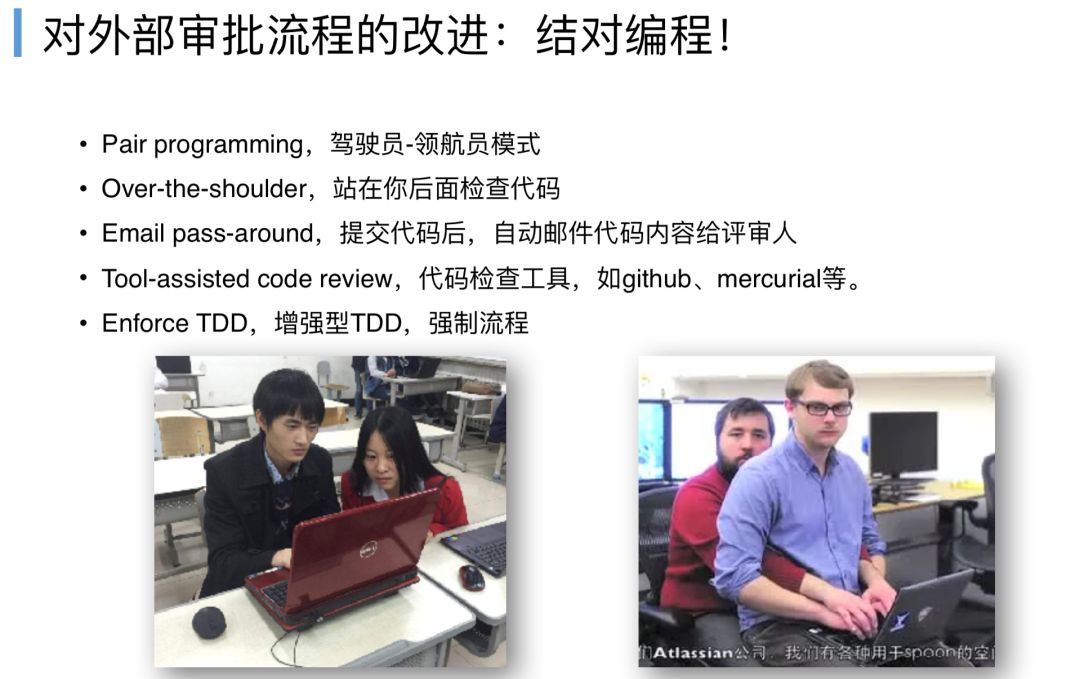 怎么样去改进外部审批流程,书中给出了结对编程,下面有两个图,结对编程不是配对编程,不是一男一女的编程,往往是两个男人的编程。