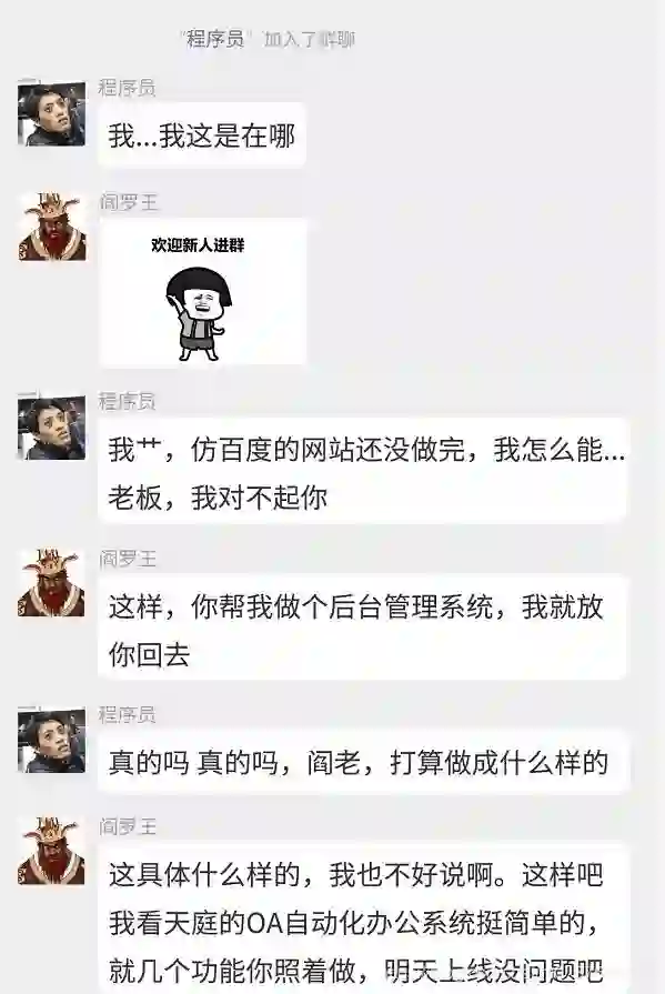 为了应对地府管理危机,阎王打算找“人”开发一套地府后台管理系统,于是就在地府总经办群中发了项目需求。