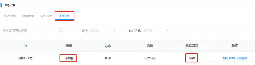 生死簿可以看到阳寿未尽、孤魂野鬼、已经转世投胎人的名单。通过查询后台数据,我们发现,孙猴子不是物理删库,他是获取了阎王爷的超级管理员权限,直接把自己的名字,从生死簿中给删除了。