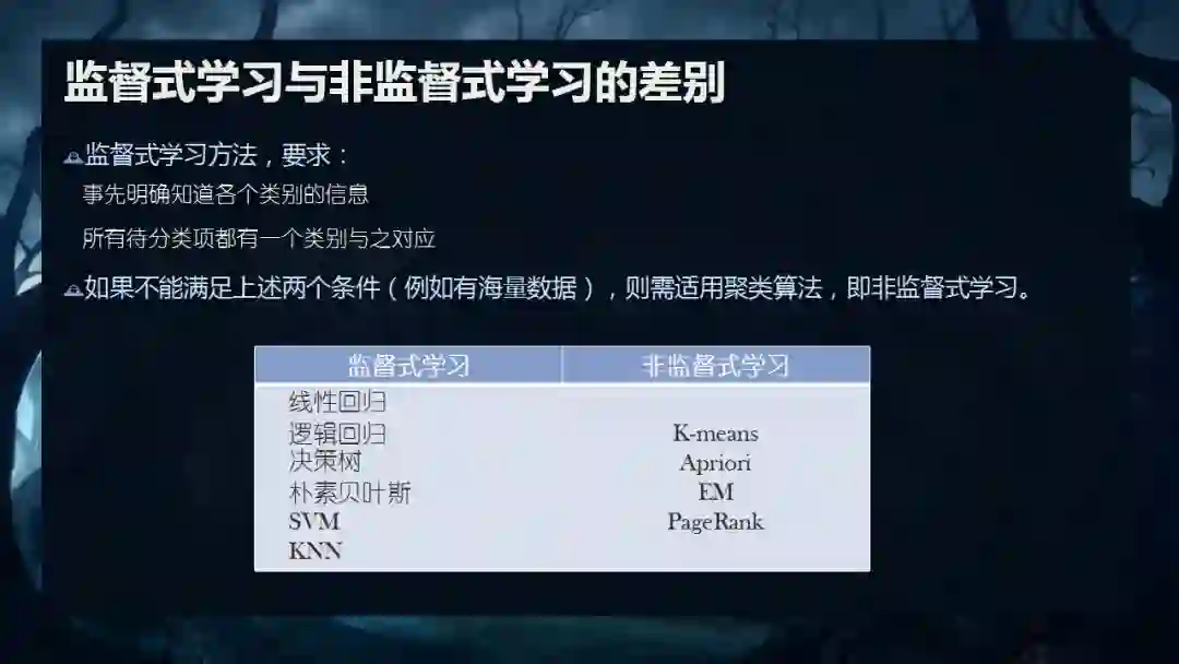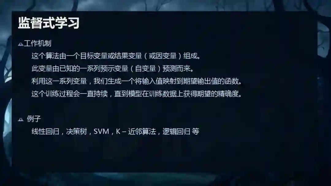 监督学习算法 (Supervised Algorithms):在监督学习训练过程中,可以由训练数据集学到或建立一个模式(函数 / learning model),并依此模式推测新的实例。该算法要求特定的输入/输出,首先需要决定使用哪种数据作为范例。例如,文字识别应用中一个手写的字符,或一行手写文字。主要算法包括神经网络、支持向量机、最近邻居法、朴素贝叶斯法、决策树等。